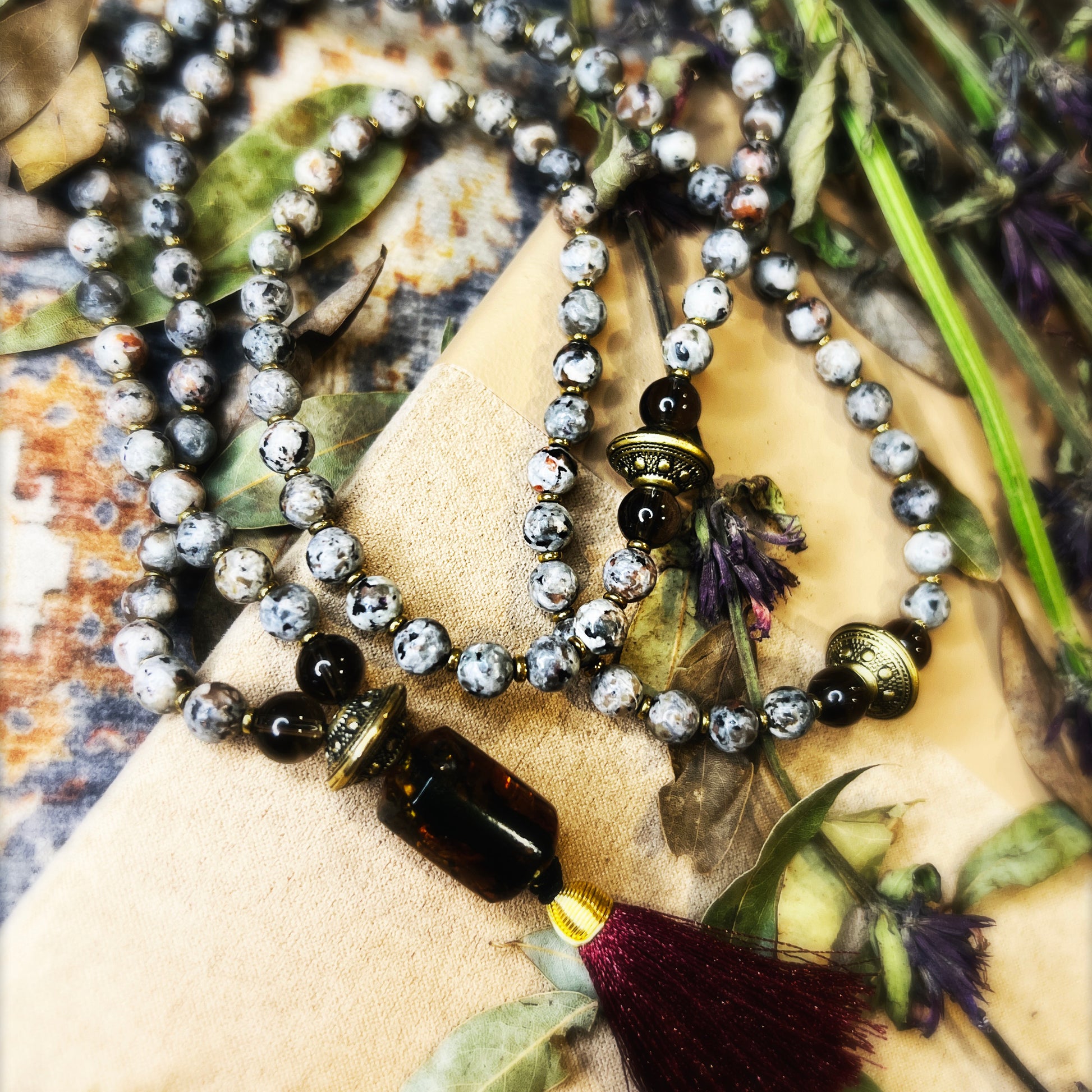 Japa mala de diferentes piedras labradas. Collar con 108 cuentas y divisiones.
